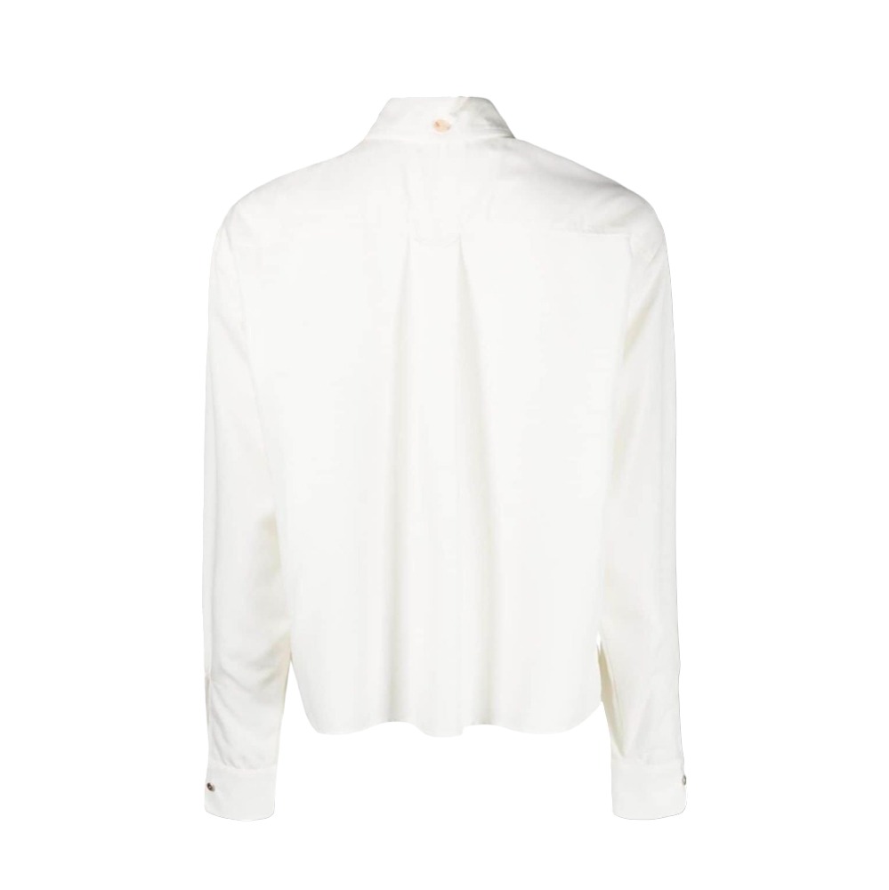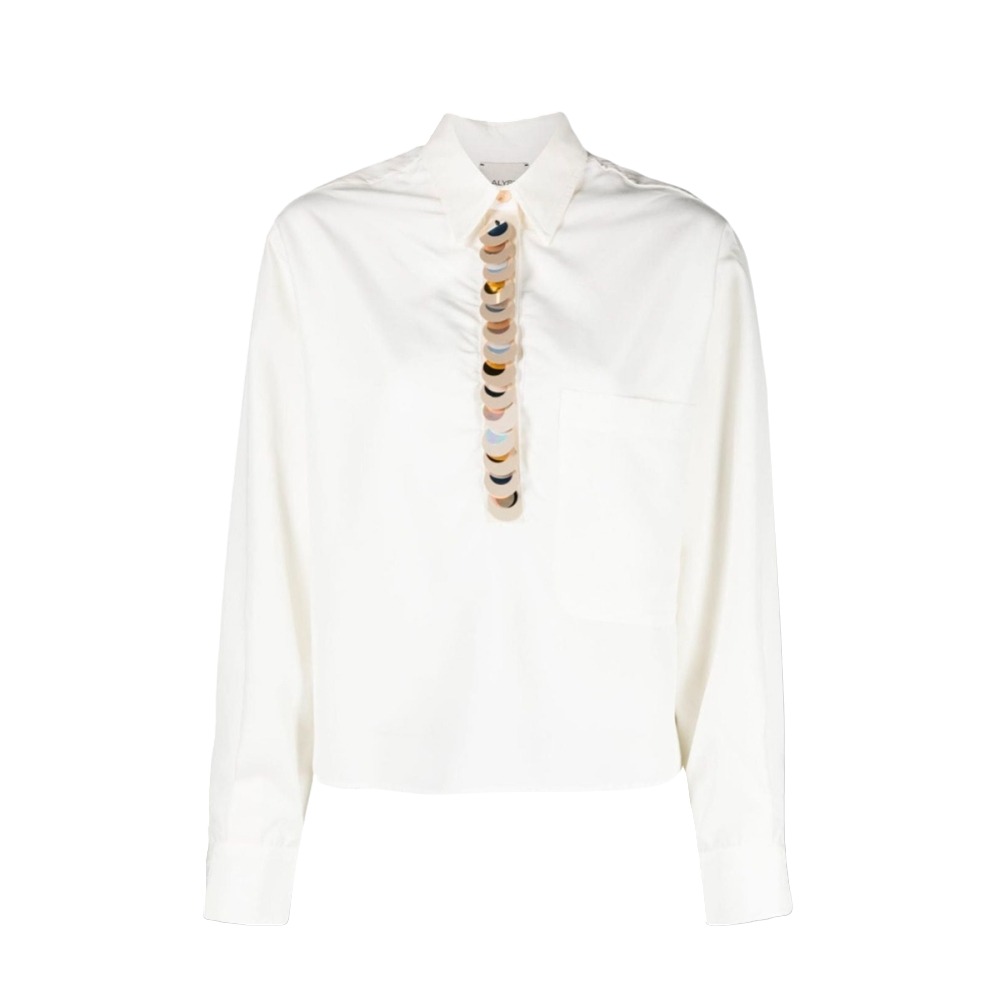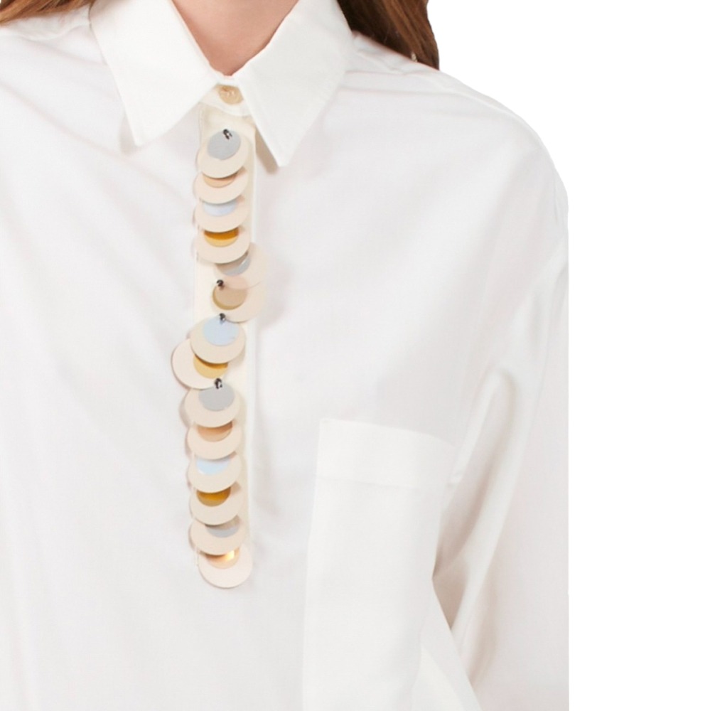 Camicia con paillettes di Alysi in misto modal, decorazione con paillettes sul fronte, dettaglio con pieghe a cannone, colletto classico, chiusura frontale con bottoni, maniche lunghe, orli con bottone e orlo dritto.