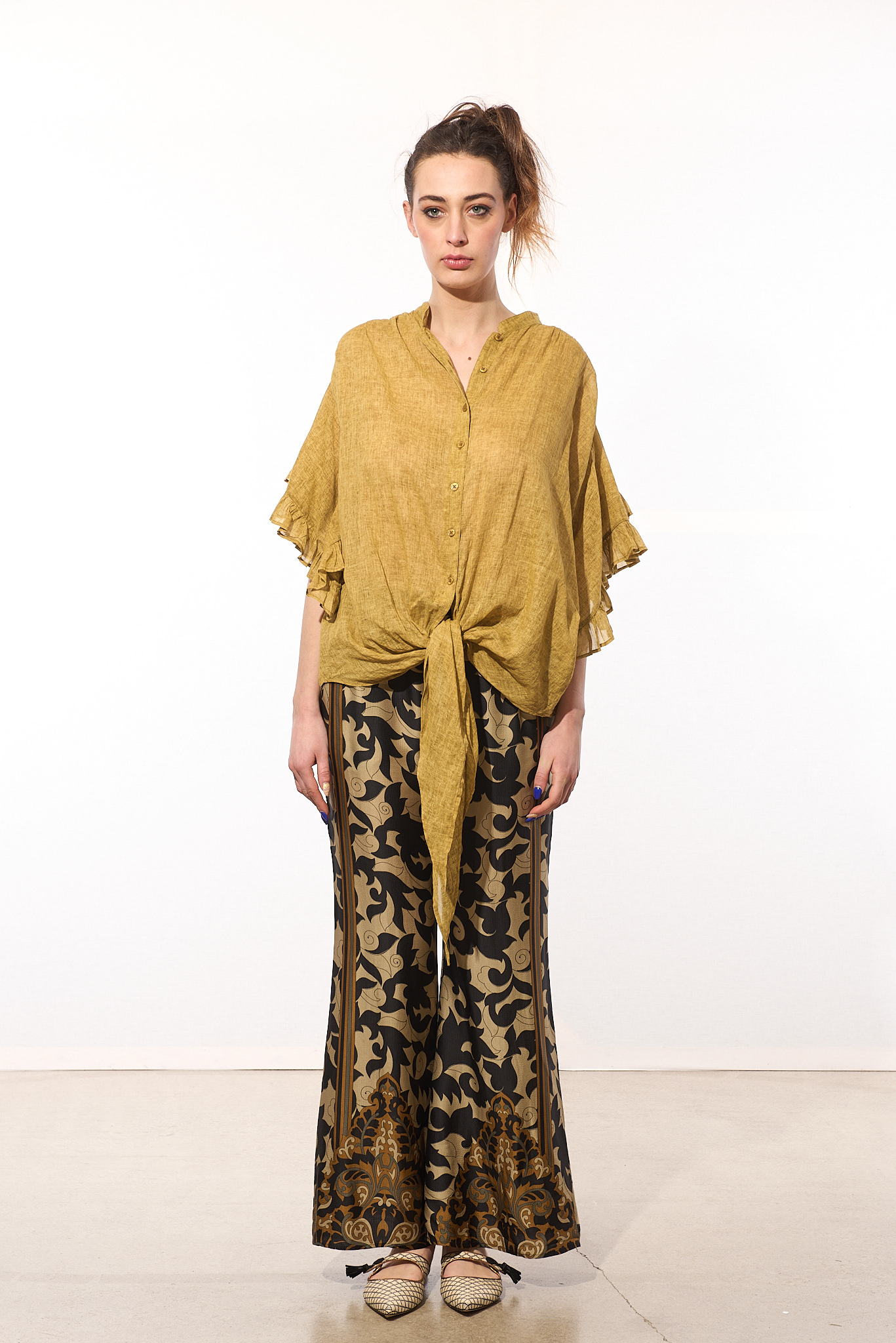 Mes DemoisellesCamicia abbottonata sfilacciataCamicia abbottonata sfilacciata-edge di MES DEMOISELLES con giallo cammello, cotone, costruzione semitrasparente, maglia fine, colletto a fascia, chiusura frontale con bottoni, maniche corte, orlo sfilacciato e dettagli a nodo.