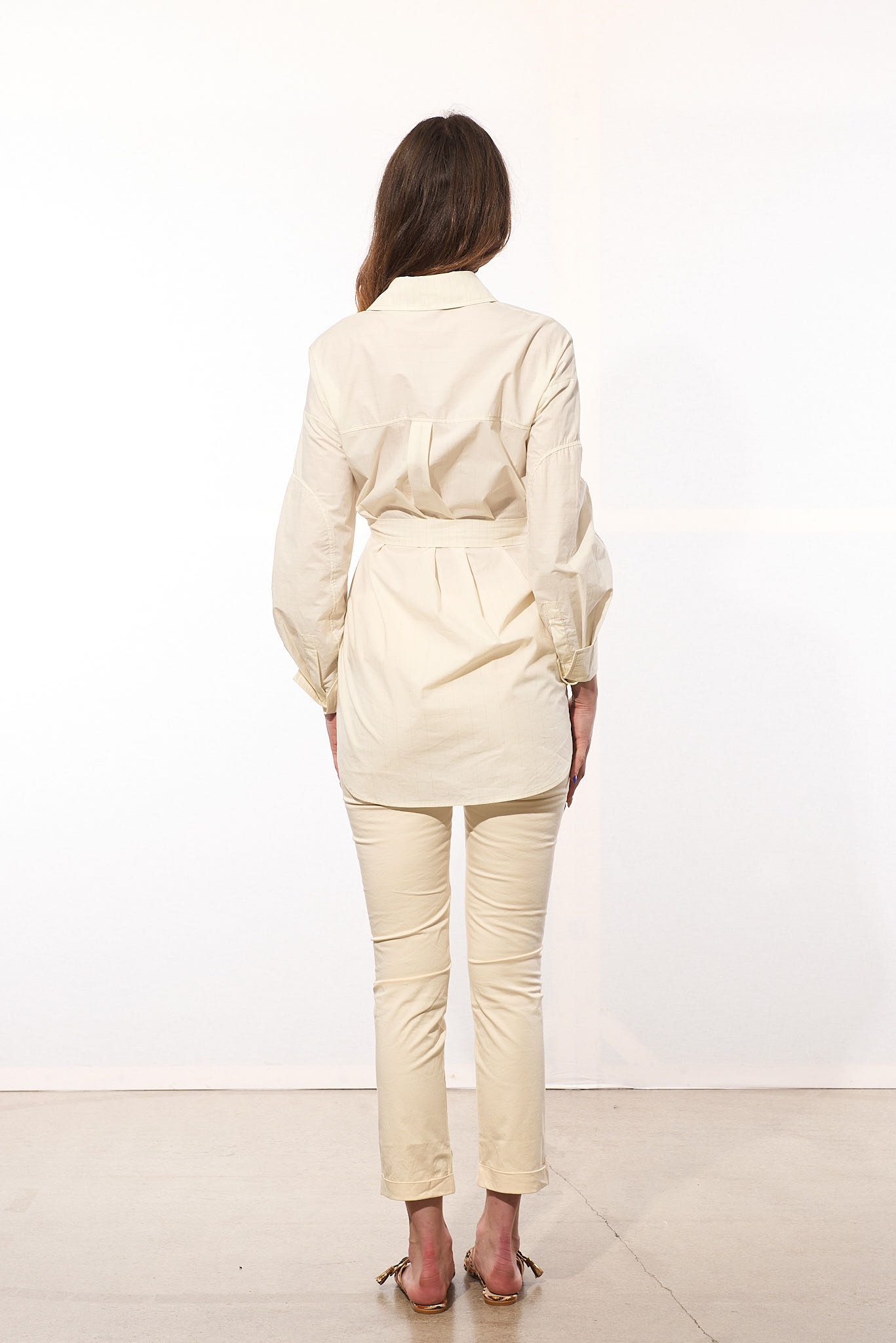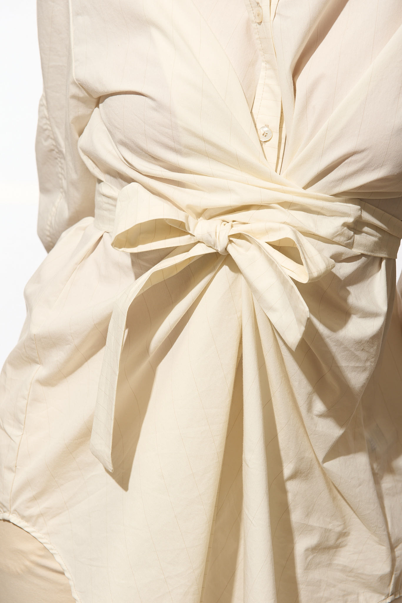 La purezza della miscela di cotone si fonde con la forma incrociata della nostra camicia lunga e il dettaglio della cintura che la chiude incrociandola nella parte anteriore.