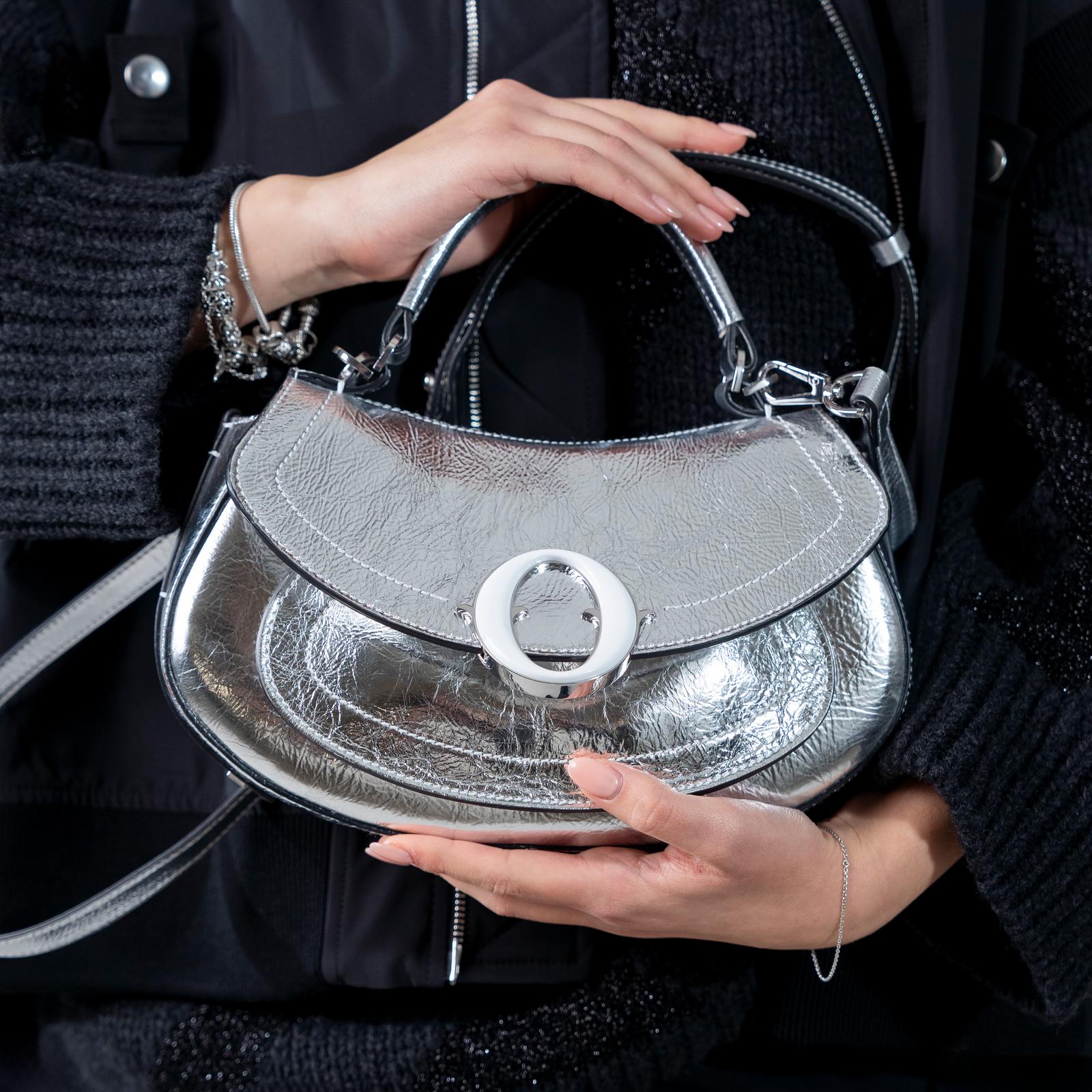 Ottod’ame – Borsa in pelle con tracolla rimovibile, chiusura a patta con gancio ad incastro, logo in metallo smaltato sulla patta, tasca frontale sotto la patta, interno a contrasto, due tasche interne aperte.