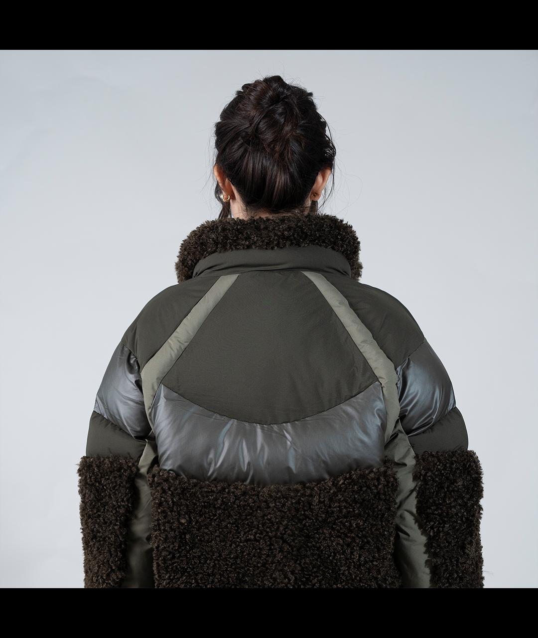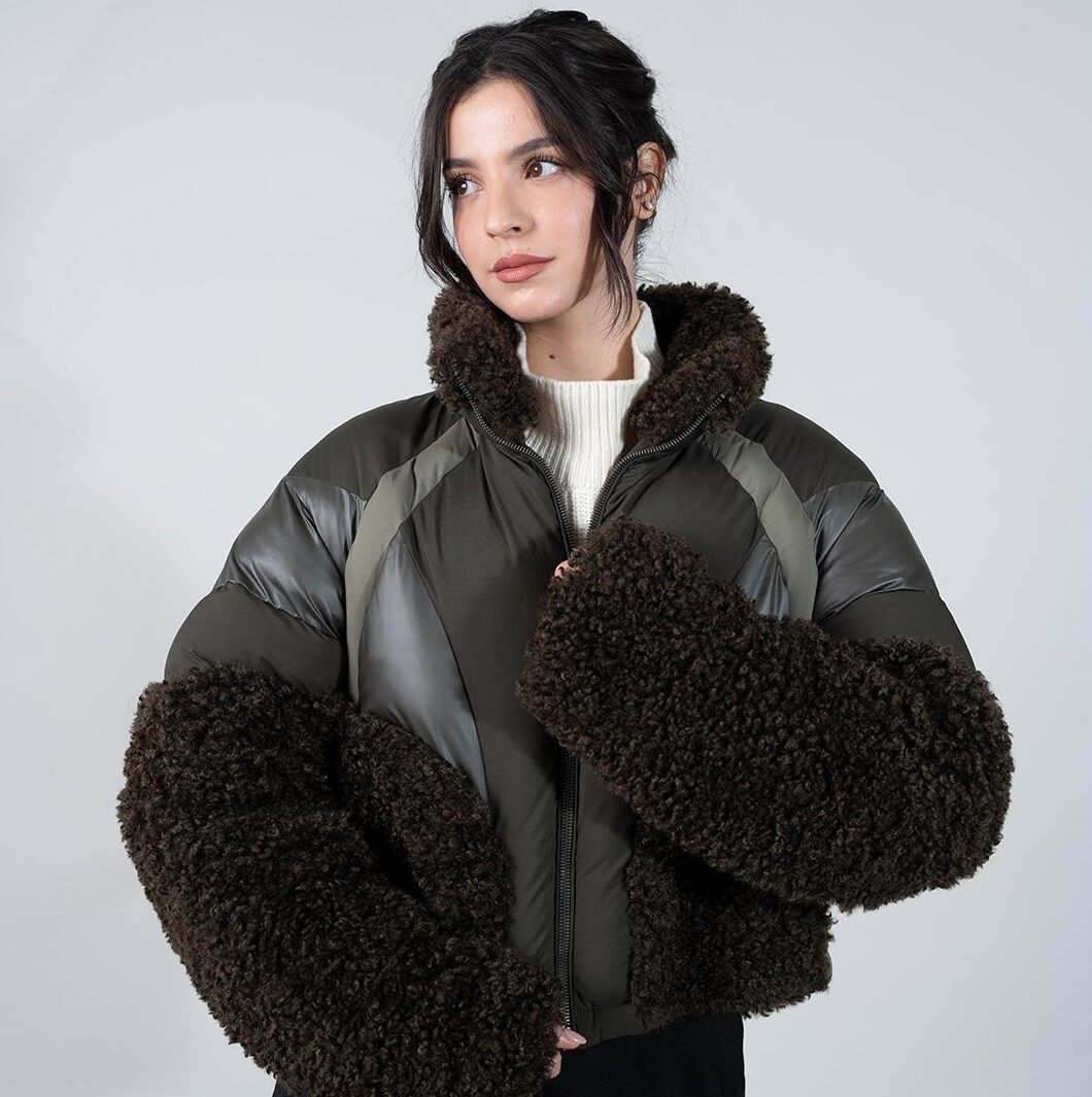 Urban Code – Piumino cropped khaki con inserti in ecopelliccia e nylon. Interno sintetico