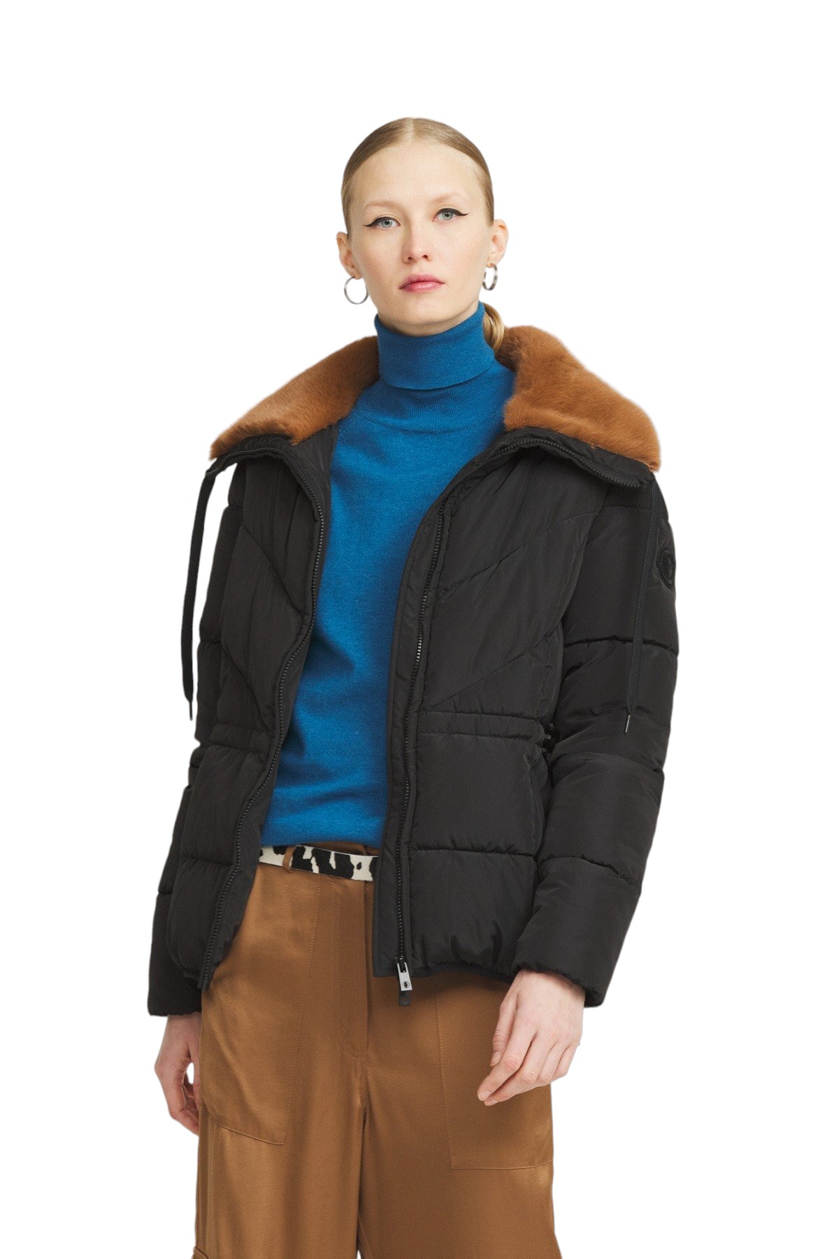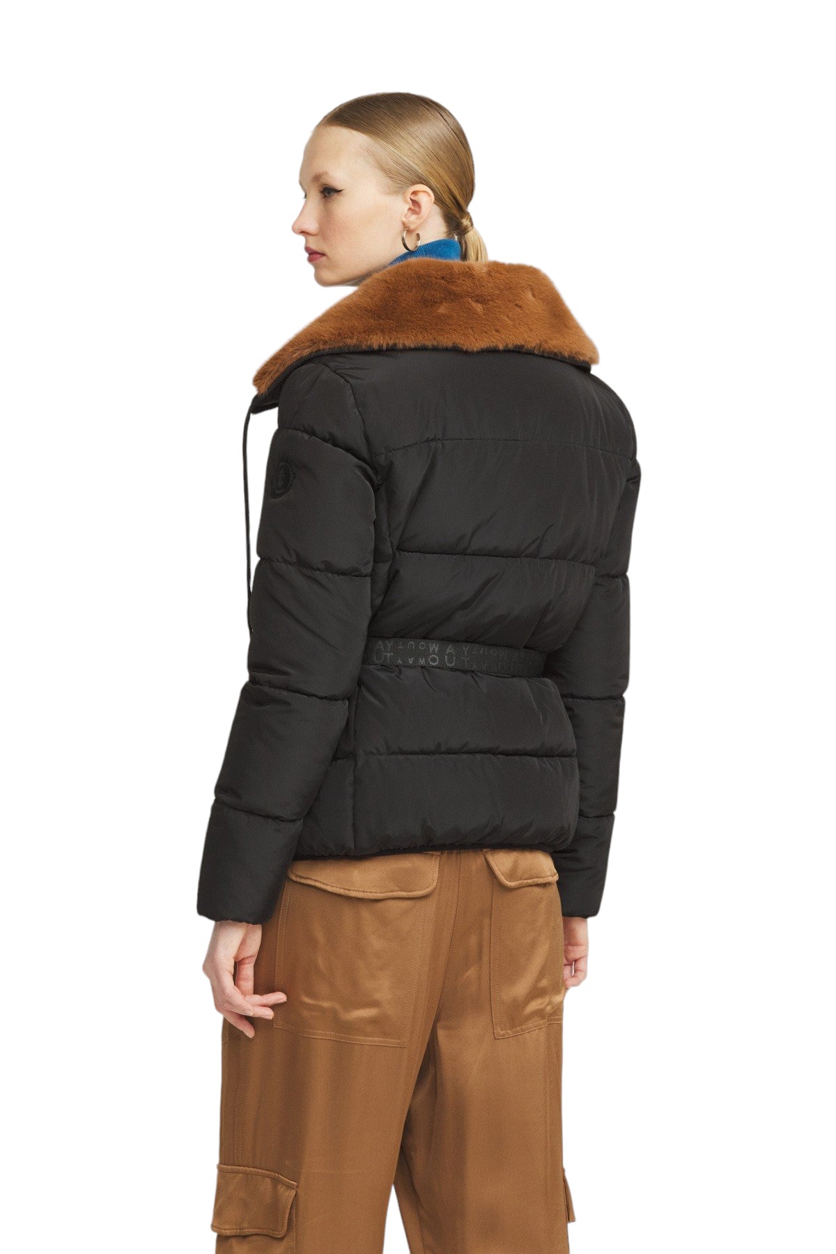 Giacca imbottita con cintura e collo effetto pelliccia.