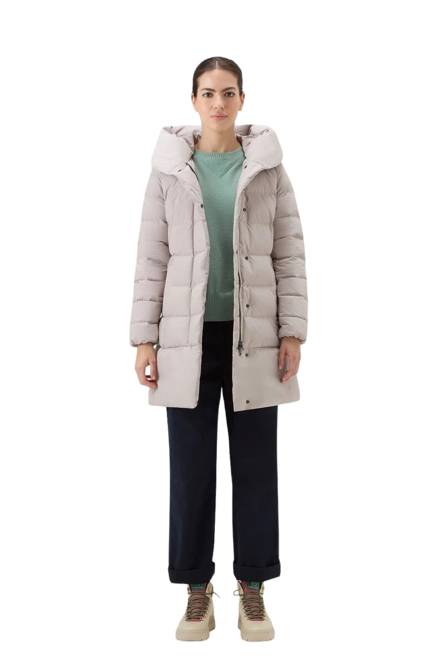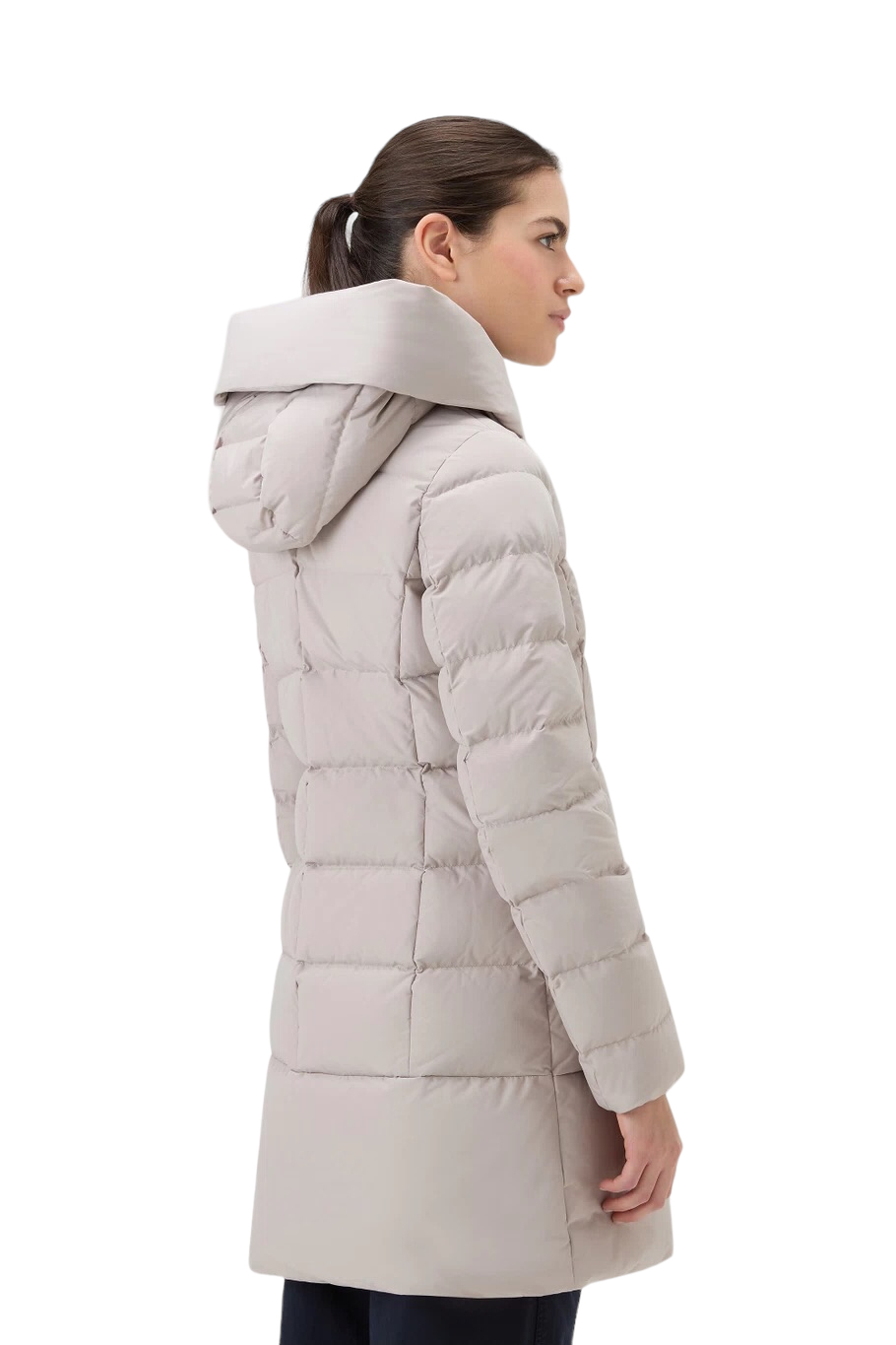 Con la sua morbida silhouette trapuntata e le sue caratteristiche funzionali ispirate al design Woolrich, questo parka merita sicuramente un posto nel tuo guardaroba. Realizzato in tessuto Urban Touch idrorepellente e resistente al vento, è imbottito in piuma d’anatra per offrirti calore e comfort eccezionali. Il generoso cappuccio garantisce di poter affrontare qualsiasi condizione atmosferica, mentre la chiusura frontale nascosta e le tasche a filetto donano al capo una linea sobria e discreta.